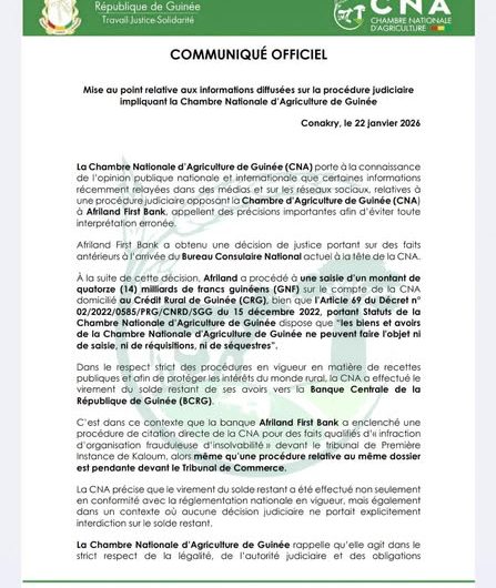 La Chambre Nationale d’Agriculture de Guinée (CNA) informe l’opinion publique nationale et internationale que certaines informations récemment diffusées dans des médias et sur les réseaux sociaux, faisant état d’une procédure judiciaire opposant la Chambre d’Agriculture de Guinée (CNA) à Afriland First Bank, nécessitent d’importantes clarifications.